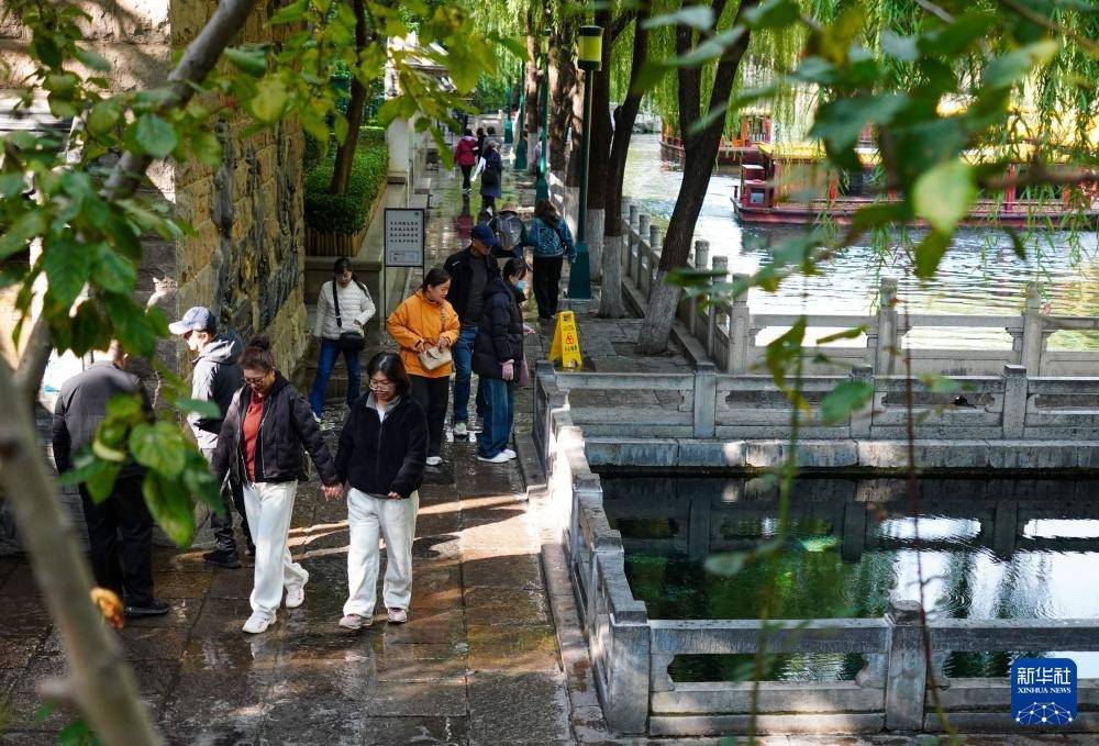 10月22日,人们在山东济南泉水绿道步行观看泉水景观。